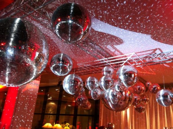 Bolas de espejo, láser multicolor, niebla artificial, humo alto y bajo, nieve artificial, chispas no pirotécnicas, pompas de jabón.